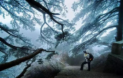 特色: 霧凇非冰非雪,而是由于霧中無數(shù)零攝氏度以下而尚未凝華的水蒸氣隨風在樹枝上不斷積聚凍粘的結果,表現(xiàn)為白色不透明的粒狀結構沉積物。霧凇形成需要氣溫很低,而且水汽又很充分,同時能具備這兩個形成霧凇的極重要而又相互矛盾的自然條件更是難得。霧松具有“美、媚、柔、透”等特點,極具觀賞性。她全方位、大面積覆蓋,裝點著天柱山的樹木、山峰、巖石、大地。風一吹來,掛著霧凇的樹...